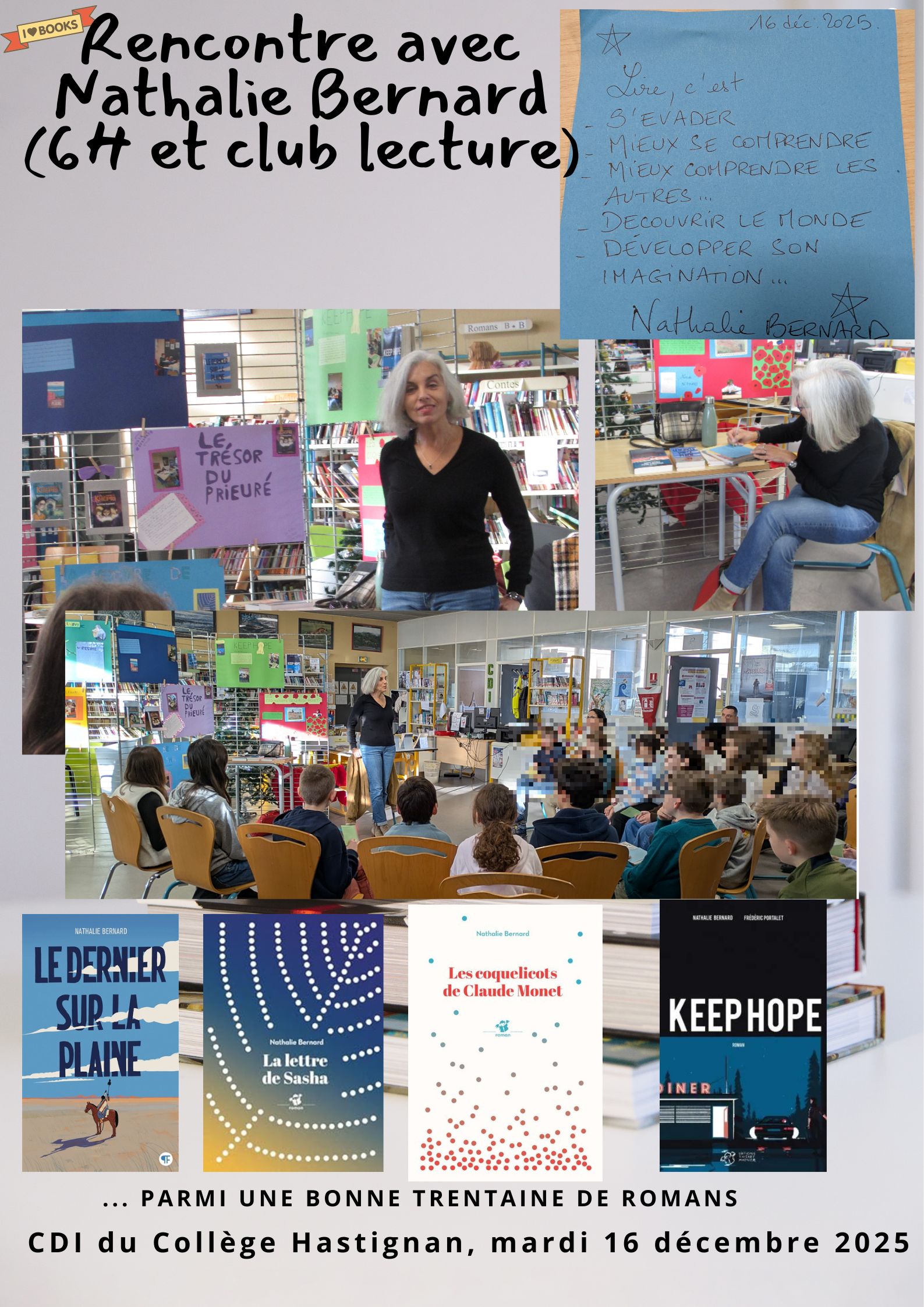 La classe de 6ème a lu sept œuvres différentes de Nathalie Bernard. Par groupes, en classe de français avec Mme Rampnoux, ils ont réalisé des affiches avec le résumé des livres. Elles ont été dédicacées par l'auteur puis complétées par toutes les informations recueillies lors de la rencontre. Celle-ci s'est déroulée au CDI, avec certains élèves du club lecture de Mme Courtade qui ont aussi lu des œuvres de Nathalie Bernard. Pendant deux heures, l’écrivain a répondu aux questions des élèves sur son métier, son style, ses sources d'inspiration... Les élèves étaient fiers et heureux de montrer leurs affiches et d'échanger avec un "auteur vivant".